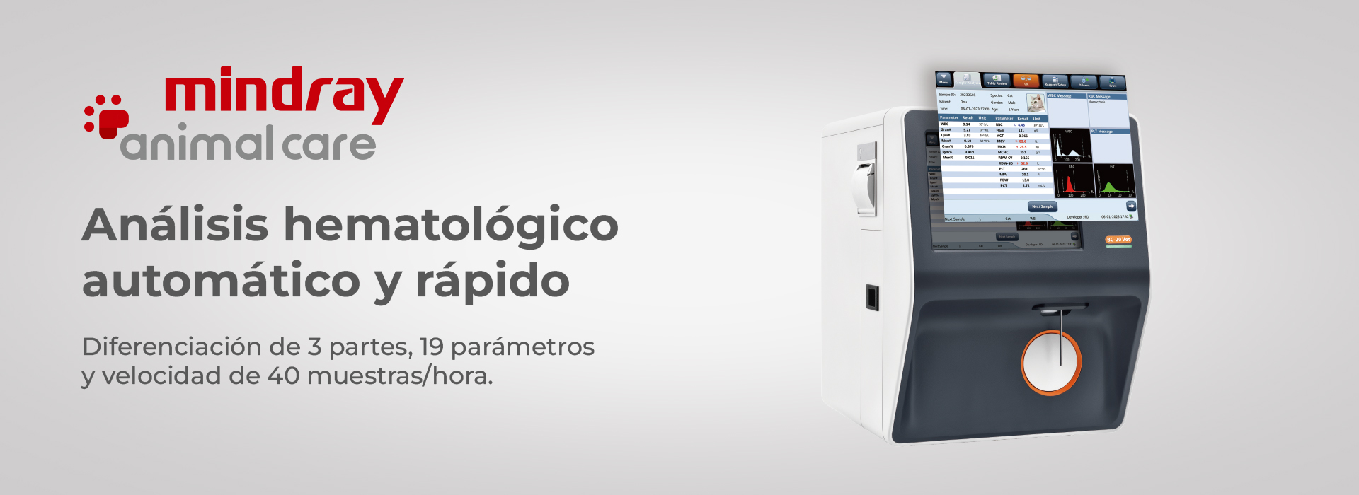 En la rutina de la clínica y el laboratorio, el diagnóstico hematológico debe ser rápido y exhaustivo. El Mindray BC-20 VET ofrece un análisis automático de 19 parámetros y 3 histogramas con diferenciación de 3 partes, compatible con múltiples especies animales. Su velocidad de 40 muestras por hora y la entrega de resultados en aproximadamente un minuto transforman su eficiencia operativa.