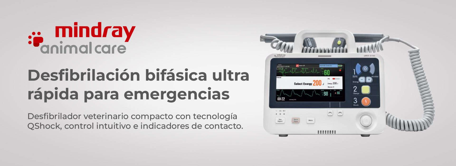 En una emergencia cardiorrespiratoria veterinaria, la rapidez y la confiabilidad del equipo son determinantes. El Mindray uMED 20VET está diseñado para ofrecer una desfibrilación eficaz en el menor tiempo posible. Gracias a su tecnología QShock, el equipo puede estar listo para desfibrilar en menos de 7,5 segundos desde el encendido, integrando carga, despliegue de ECG y preparación de descarga en un flujo optimizado.